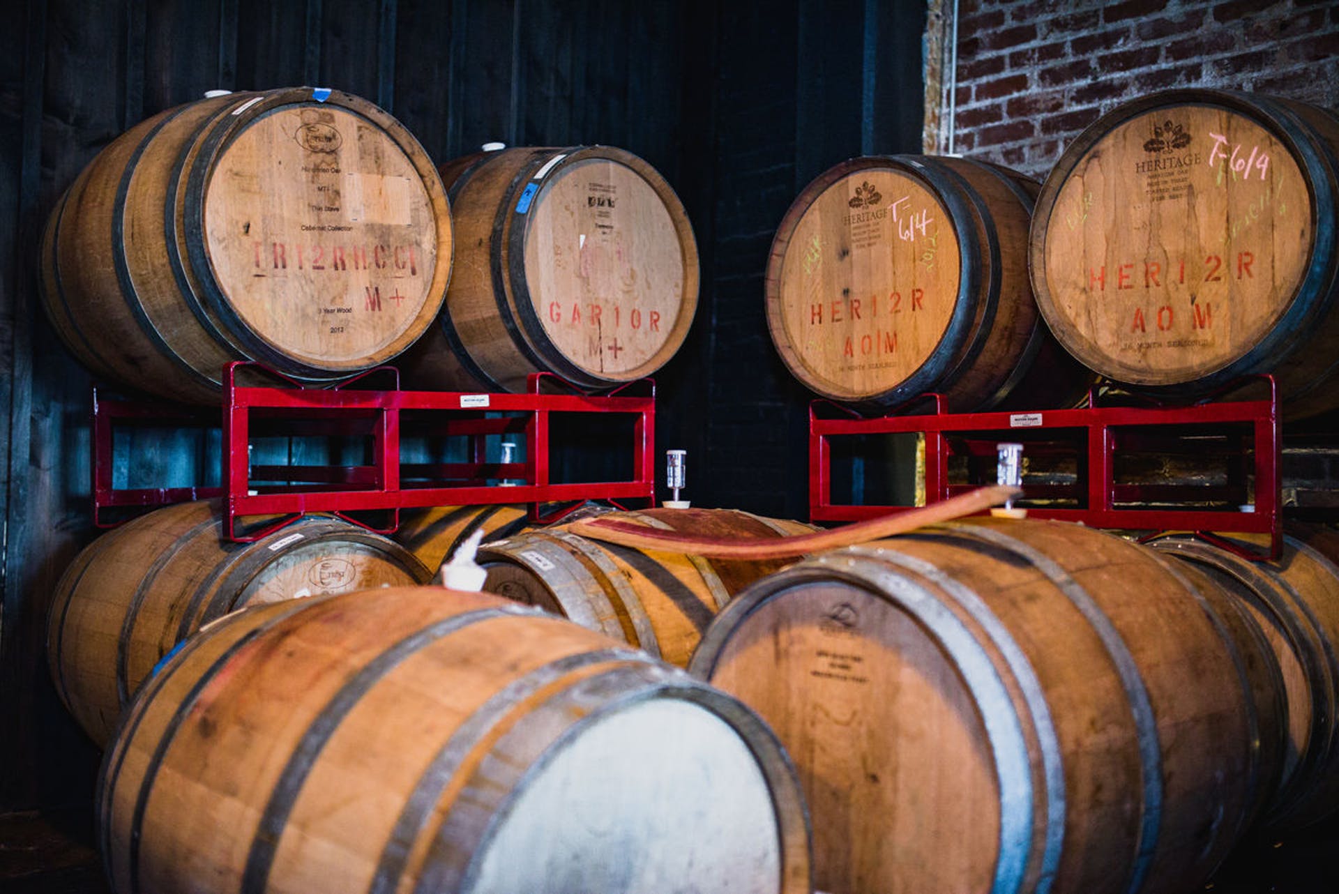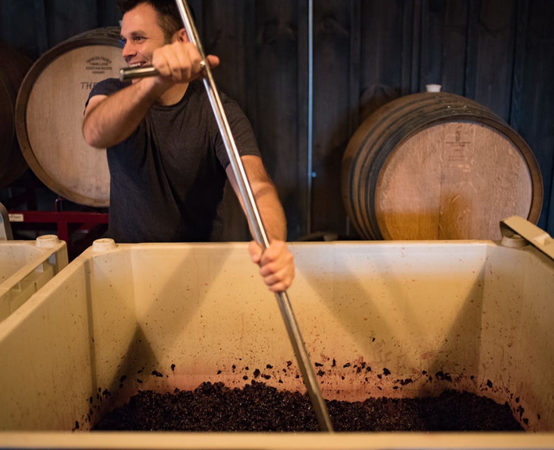 Owner Kate MacDonald and her husband in the barrel room. | Louis Rideout